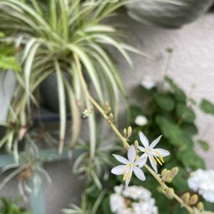 オリヅルランのお花が咲きました! 以前にも咲いた時に投稿しましたが お久しぶりに見たら やっぱりカワイイ💖ので投稿! 何ヶ所か咲き始めています✨ 遠くにいるオリヅルランから ビョーンと伸びて咲いてます♪ アップで見ると葉先が枯れてるのも ありますね💦