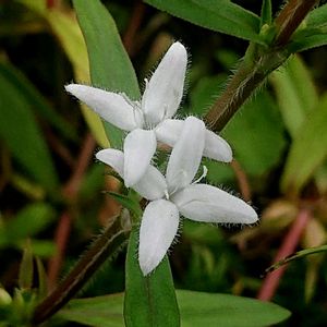 メリケンムグラ 河原の湿り気のある場所。ため池湖岸、放棄水田、田んぼの畔道に育成 茎は四角形。綾に毛があり、地面を四方にマット状に広がる 接地した茎から根が出る 夏に先端が四つに分かれた白花を咲かせる 花弁には微毛があり、1日花である 葉は対生する単葉。表面はやや光沢がある。 果実は分果で2個づつつき、しばしば水に浮かんで散布する 田んぼの畔道の可愛い白花と果実