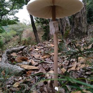 滝へと続くお気に入りの山道を歩いていると、道から外れた斜面の下に、白いキノコらしきものが見えました。 勇気を出して近くまで行くと、今までに見たこともない巨大なキノコが1本、すくっと立っていました。 高さ40cm以上、カサの直径20cm位あったと思います。 帰宅後Aiにカラカサタケと教えてもらいました。 違っていましたら、お教えください。 食べられるキノコだったらしい、残念😞 10月16日撮影
