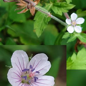 mimozaさんの 🏷日曜日は日本を感じる和の花 可愛いゲンノショウコの花がもう種が弾けたオミコシになっています、まだ種が2粒付いていますね🤍💜🌿 フウロソウ科 フウロソウ属