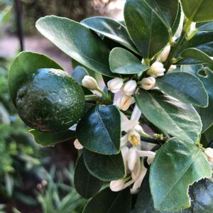 こんにちは🌞 鉢植えをしていた大実金柑が先日の台風で玄関から転がり、先週、西側に地植えしてたら、花が次々に花が咲きました。実と花を同時にpicできました🎶💕