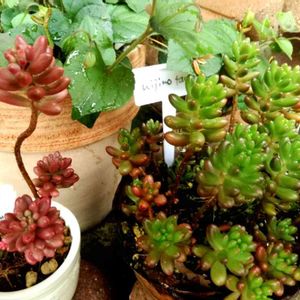 ワイヤープランツの 横に座っている ベビーサンローズと グリーンネックレスの 横に座っている コーカサスキリンソウ。 よく立ち寄る花屋さんに 前から気になっていた ベビーサンローズが ちょこんと座っていたので 目が合った瞬間、キュンと なって思わず連れて 帰って来てしまいました。