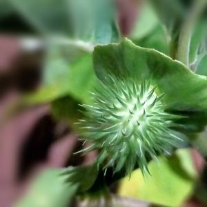 ケチョウセンアサガオ 毛朝鮮朝顔 2/2 見下ろしのアングルだと ちょっと見えにくいのですが、しゃがんで葉っぱをペロッとめくると… いたいた! ものすごいトゲトゲ君な実!!! 実の大きさは3〜5cm。 (この写真の実は3cm弱位) 触ってみたい好奇心も湧いてくるけど、やめておきました。 完熟すると 不規則に裂けて種が溢れます。 撮影 2021 8/25 スマホ よそ様のプランター 同属のヨウシュチョウセンアサガオのお花、裂けた実の投稿 2019 11/6