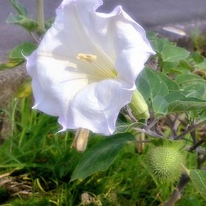ケチョウセンアサガオ (毛朝鮮朝顔) 別名:アメリカチョウセンアサガオ 北アメリカ🇺🇸原産の帰化植物で、全草にアルカロイドを含む有毒植物。 茎や葉の裏に 微細な«毛»が密生しています。 花🌼は 夕方 上向きに開き、翌日の昼頃には しぼみます。 花後、球形で トゲに包まれた果実を下向きに付けます。 🏷白い水曜日♡