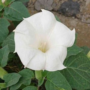 ケチョウセンアサガオ ナス科 チョウセンアサガオ属 葉は幅広で付け根近くは丸みがあり先端に向けて細くなっている 葉の縁が波打っているものが多い 花が最も特徴的で甘い香りのするラッパ状の花をつける。特に端の方が淡紫色になる 先が細まった部分が5ヶ所あり、葉の周りに対称的に配置されているそうです