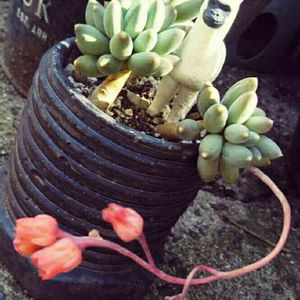 こんにちは😃 本日2枚目です🎵 乙女ちゃんのお花🌼がようやく一輪咲いてくれました〜(*´艸`) 骨💀子も喜んでまーす😆 アルパカ🦍は心配そう… 以上 速報でした!