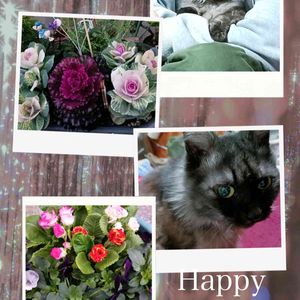 明けましておめでとうございます🎍🌅🗻 本年もどうぞ宜しく お願いします😌💓 新年は葉牡丹とバラ咲きジュリアンを📸 そしてクー😺の頭で 🏷どたま祭り に参加しま〜す🎵