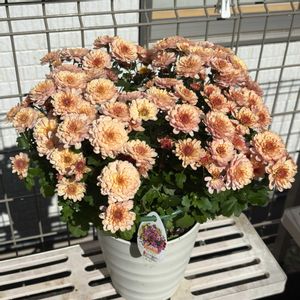 こんばんは😊 今満開で綺麗なお花マムです💖 ①クリサンセマムアラモードアプリコット ②ガーデンマムジジ ④は雨の日にパッカーンってなったクリサンセマム😆 これを中央にまとめるように 小さな支柱を使って寄せてます笑 あとどれくらい咲いてくれるのかなー