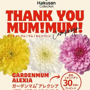 Thank you MUM 「ガーデンマム アレクシア」 プレゼントキャンペーン! かわいさ詰まったマカロンカラーの小さな花! ハクサンコレクションのガーデンマム アレクシアを3色(3ポット)セット30名様にプレゼント! 今年の秋冬は、かわいいガーデンマムとともに毎日を過ごしてみませんか。きっとその可愛らしさに、心癒される日々が待ってますよ。 --------------------------- 応募期間 9月12日(金)~9月21日(日) まで --------------------------- ◎応募はこちらから https://hakusan1.co.jp/ たくさんのご応募お待ちしております。 賞品のお届けは10月初旬頃を予定しています。 当選発表は、賞品の発送を以って代えさせていただきます。 ※本キャンペーン企画は株式会社ハクサンが実施するものです。