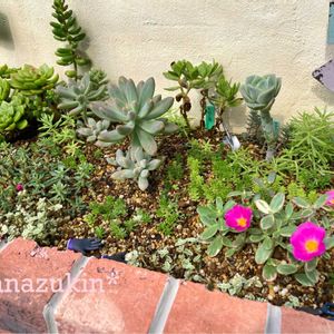 引き続き、アプローチ花壇の夏越し報告です。 このスペースは写真が多いので、2回に分けて投稿します。 ★写真1枚目 全体像です。 ここは乙女心がメインのスペースです。 手前側はジオラマの続きで、木立多肉を植えていましたが… 木立系多肉はほとんどがダメになってしまいました。 花壇の真ん中のあたりで、そこまで日が当たっていたわけではない思うのですが、そのわりには禿げ散らかしている感じです。 ★写真2枚目 上から見た様子です。 夏前は乙女心でギッシリしてましたが、スカスカになったのでモリムラマンネングサなどを植えました… ★写真3枚目 かろうじて生き残った乙女心たち。 鉢植えのほうはもっとダメになっているので、それよりはマシですが、だいぶ数も減りました。 残っているものは、葉っぱはぷくぷくしてますけど、相当下葉が落ちてます。 ★写真4枚目 切株モルタル鉢の寄せ植え。 残っているものは伸びまくっている&ハゲハゲです…、 ★写真5枚目 切株鉢の手前のスペース。ここは案外元気ですね… ちょこっとだけ試しに植えてみた、姫秀麗×プロリフィカがそこそこ元気です。 うさぎの右にある黄色いのは「緑斑細葉黄金枝変わり」です。 鉢植えだと季節の変わり目でダメになりがちな種類なんですが、地植えだと元気ですねえ? その手前にあるノビノビな赤いのは立田鳳。伸びすぎて原型をとどめてませんが元気そうです…。 手前にある謎のネックレス(三日月ネックレスかな?)も元気そうです。 次の投稿に続きます。