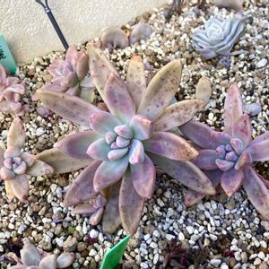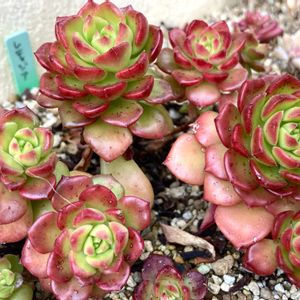 おはようございます。 夏の脱落者が多かった「アプローチ花壇」の手前のほうのスペースで…ほぼ弱らず元気だったのがこのグラプトたちです。 夏前の写真と比べると、一回り大きくなっています。 名前はわかりません~💦 私が多肉を始めた3年前、メルカリで買ったカット苗セットに入っていたものです。 買った時は小さかった苗が、みるみるビッグに育ったので最初はびっくりしましたが😳 まあ~、今思えばそこまで大きいわけでもないのですが… 実家プランターに植えてある「ダスティ」に比べたら赤子のようなものですよ😁 ※本当に大きいんです、ダスティ…、直径30cmくらいあるんですよ~ そして、ぱっと見全部同じように見えますが、手前3つと奥の2つは種類が違うようです。 ほんのりした違いしかないので、区別がつきにくいのですが… 上から見ると(写真2枚目)、奥の苗のほうが少し淡い緑色なのがわかるでしょうか。 この手のグラプトはとっても種類が多く…、 あまり場所がないうちでは、グラプトペタルム系はほとんど育てていないので、多肉にある程度詳しくなった今でも、種類の特定が困難なのです。 「これじゃないの?」と思う方がいたらぜひ教えてくださいね! 先日の「だるま秋麗」の投稿でも書きましたが、今年の夏越しはグラプトペタルムは強かったです。 これからこの地植え花壇には、グラプト系を増やそうかな~と思っています…。 あと、奥にちらっと写っている黄麗が無事だったのが意外!鉢植えは日当たりいい場所にあったせいで全滅しちゃったんですが… この黄麗は、奥のほうであまり日が当たらなかったからかもしれません。 あと右にある暗い緑のエケベリアは「メラコ」です。 強いと聞いて植えたのですが、この子も無事でしたね~。 冬は赤くなるので楽しみですよ! 過去の様子は 🏷はなずきんアプローチ花壇 で見られます。
