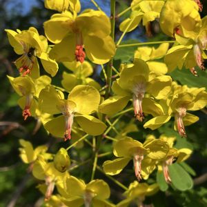 ジャケツイバラ(蛇結茨) マメ科ジャケツイバラ亜科のつる性の落葉低木 マメ科の中で唯一の木本性つる植物です 分布は主に本州(宮城・山形県以南)から沖縄まで分布 川のすぐ側とても陽当たりの良い所で咲いていました。 ②花は黄色い5弁の花で、上側の1枚だけがやや小さく赤い筋や模様があり、赤く目立っている蕊が雄蕊で10本、中央にまとまって束になっています。 雌蕊はこの中に隠れるように在るそうです。 ③は花序を上から撮影してみました。放射状に花茎をだしてますね!そして緑色の蕾がまだ在ります。 ④ 茎や枝に鉤状の鋭いトゲが多く、枝が他の木に絡み合って高く高く上方へと絡み上がっていました。 そんな姿を⑤に入れてみました。 そして昨年の果実もまだ沢山付いていたので一緒にコラージュで入れてみました。 ⚠️この種子はおよそ1㌢くらい。 有毒成分が含まれており、誤食すると嘔吐を繰り返すなどの中毒症状を引き起こすことがあるのでご注意を この大きなジャケツイバラから少し先のお山の中で沢山幼木を見つけています。高木が茂って上を見上げてもこの鮮やかな色のジャケツイバラの花は見つかりませんでしたが、黄色い花弁が落ちていたので、花を咲かせた木がある筈です。以前ジャケツイバラの冬芽葉痕を撮影したのは、ここの幼木でした 咲き始めて間もない綺麗な状態のジャケツイバラに出逢えて🙌 とても綺麗でしたよ〜🥰 📷 2025/5/8 越生町