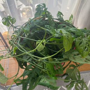 モンステラアニータの成長が早すぎてびっくり🫢 横に伸びていく蔓をかごの周りに巻き付けてみた🧺 これからどうやって仕立てていこうかな🌱