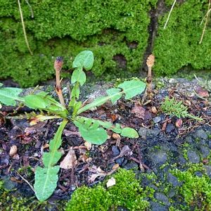 古くなったアスファルトの隙間から、ツクシとタンポポか生えています。 日陰で、苔むした場所にも、しっかりと春が訪れていました。