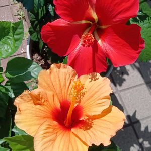 おはようございます🤗 🌺ハイビスカス🌺 先日の朝、玄関に出ると赤とオレンジのハイビスカスが揃って咲いていました😊