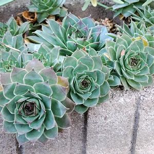 玄関先の片隅に相方が植えた名無しのセンペルビウム 元々は、大きく育った沢山のセンペルビウムの子達の一部を移植したのですが、程よいサイズで可愛らしく育っていてひと安心 筒状のブロックを埋め込んで、鉢代わりにしたのが功を奏しています👍