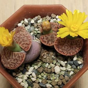 あちこちでリトープスの花が咲いたり咲きそうになっていたりするのを見ると、思わず笑顔になります😊(相変わらず黄花率高し) 品種不明の謎コノフィツムも花が咲き始めて、冬型メセンが動き始めたのを実感します😊 気がつくと前日動きがなかった株が花芽を伸ばしていたりするので、平日は日中多肉たちを見る事が出来ないのが残念です😔