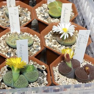 ブルゲリとHot Lips、深窓玉、名前不明のリトープス ブルゲリは濃いピンク(マゼンタ系)と白のバイカラーのお花で可愛らしいし、リトープスは最近は白花が咲く率が上がってきているのが嬉しいです😆 名前不明のリトープス、私としてはStorms's Snowcap(白花日輪玉)じゃないかと思っているのですが、特定出来ません😓💦 以前育てていて☆になってしまったStorms's Snowcapに似ているんだけどな〜😑