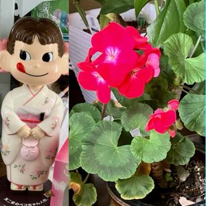 おはようございます😃 私の家🏠のゼラニウムと 今年最初の🏷️ペコちゃん祭り 着物👘のペコちゃんで参加します。