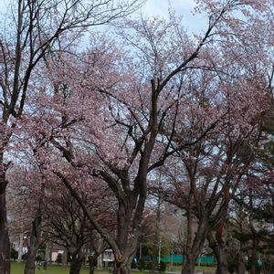 🎶桜が咲いた咲いた咲いた 桜が咲いた幸せ色に〜🎶 青い空に桜🌸 北海道も桜が咲き始めましたよ〜 (公園にて夫撮影)