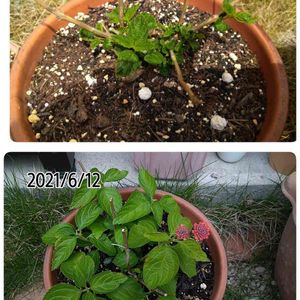 冬に枯れ枝のようになり、4月に少し葉🌿が出てきたランタナ(七変化)のその後です。 葉は青々と茂り、今朝花が咲きました😍 明るくなれるカラフルな花、早く見たいな…今から楽しみです💕