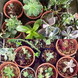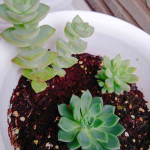 多肉ちゃんの寄せ植えしました🤗 夏なので心配ですがヾ(๑╹◡╹)ノ"🪴🪴🪴 「静夜」と「花の想夫恋」とを購入して以前の我が家の鉢から移動させて寄せ植えしました(((o(*゚▽゚*)o)))♡💚💚💚 ◎静夜 品種:静夜(せいや) 属名:エケベリア属 別名:デレンベルギー、ホワイトローズ 生長の姿:全体に大きくなります 生長のスピード:普通 休眠:しない 紅葉:秋に葉の先が赤くなります。 環境:高温多湿が苦手です。 夏の時期 苗の置き場:直射日光の当たらない場所で風通しの良い場所がよいでしょう。 水やり:土が乾いていたら、夕方に水やりをしましょう。 株の姿:紅葉はなくなり、緑色をしているでしょう。 植え替えの可否:しない ◎花の想夫恋 エケベリア 花の想夫蓮 Echeveria Hananosoufuren 綺麗な花型にまとまりやすい「花の想婦蓮」花うららと相府蓮の交配からできた多肉ですが 親の相府蓮とは違う漢字の想婦蓮ですので 少しややこしいです。 夏場は緑色になりますが紅葉期には真っ赤に染まりこれまた圧巻です。 花は多花性で黄色の花を咲かせてくれます。 💚💚⭐️⭐️⭐️☆*:.。. o(≧▽≦)o .。.:*☆⭐️⭐️⭐️💚💚