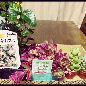 先日ホームセンターで連れ帰った多肉ちゃん。名前が分からず調べたところ、多分、群月花(左側)、万宝(後ろ)、黒兎耳(右側)だと思う…😅 気温も上がってきたので、外管理をしているのですが、群月花から子株がたくさん出てきて隣の黒兎耳を押してる感じになってきてる🤣 ちょっとこれは別の鉢に植え替えて育ててあげた方がいいかもしれないな😣