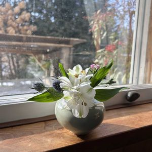 窓辺の小花です。家の中は半袖でも過ごせる感じですが、一歩外へ出るとキーンとした凍(しば)れが‼︎‼︎ 窓越しの陽射しが気持ちいいです。 花器: 小さな丸い花瓶 花材: アルストロメリア、小菊、アメリカナデシコ、エリンギウム