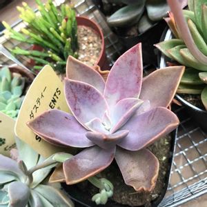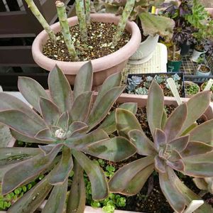 【エケベリア属 ダスキィ】 Echeveria 'Dusky' 流通名 ダスティ (交配種) 抜き苗をいただいたのですが、 名前が分かりません( ω-、) ライターと比較しても、 かなり大きな多肉です🚬 ( ・ω・)∩シツモーン どなたか名前を教えていただけますか? 🌱お礼🌱 速攻ですずきさんち様に、 名前を教えていただきました スズキサンチチャン、イツモアリガトウ ( ˘ ³˘)♥ 【羽兼直行】さんの著者には、 「作出不明 日本では【ダスティ】と流通 茎は太く長くなり、大型で花は黄色」 と記載