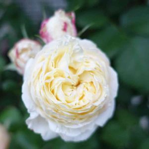 コロンとまあるいフリュイ🌹🌿2年目の春の花 優しいクリーム色の花弁に、少しの紅が入る可愛い花弁 フルーツの甘~い香りがする🍌🍈🍊ミックスジュースみたい😋なイメージ コンパクトな樹高なので玄関脇に鉢を置いている。 このこも、ぎゅうぎゅうの花弁が、ボーリングしやすい😅