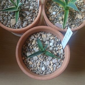 アガベ記録写真 2018/6/13撮影 ウチのアガベ番号98番 「スノーグロー」さんです♪ ブルーグローの斑入り、 黄覆輪なら「サングロー」 白覆輪なら「スノーグロー」 ですが…、 このスノーグロー白覆輪とはいえ、 かなり黄色に近い所謂クリーム斑なのも有名な話…、 似たモノなら…っと私はサングローだけ育てていたのですが、 ほどよい大きさと値段で、 同じスノーグローでも白っぽい斑の子との出会いがあればと秘かに探していたところ…、 出会いが!(>_<)ノ 丁度サングローと同じぐらいの大きさ♪ ノーマルのブルーグローだけ少し小さいけど、 3鉢並べると面白い♪(*^.^*) 並べた姿はまたいつか♪