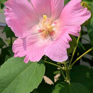 8月は葉月(はづき/はつき)、木々の葉落ちの月(はおちづき)とされる。 これは旧暦、現在でも使用されることもあるが、現行歴とはその1〜2月後位の季節感のずれがあるという。  最近、年毎にその熱さが増し暑さも募るようであるが、私の散歩道の道際等の草花達は、その熱い陽の中にあっても、己が自身を一生懸命に、最大限に自己表現に向けようとしているようだ。 7月からの、熱い夏へ、夏の草花達の姿 ---その10。   /風中ピンク5弁花、       真青空仰ぎながら白い‘しべ’隠すように/  7月は梅雨が明けた、その下旬の何時もの散歩道の道際。 その散歩道は、久しぶりの青空の真夏の様相に中に。道際の草花たちは強い陽を浴びながらも、しっかりと背筋を伸ばしてその青空に向けていた。 そこに出逢い見たのは、その真っ青な空を仰ぎ見るようにして、2mいや3mもあろうかの低木の先ほどに、花径15cm以上はありろうかの綺麗なピンクの5弁の花が幾つか。 それは、真夏の少し強い風にの中、それにあがらうようにも、白っぽいしべ(蕊)を隠すようにして、その花弁をすぼめるようにして、ジッと堪えていた。       フヨウ(芙蓉/モクフヨウ<木芙蓉>) <‘フヨウの一般的な特徴’ について、下記の「フヨウ」より抜粋、次に:  花は5枚の花弁を持ち、中心には特徴的なしべがある。 しべは多数の雄しべが癒合して筒状になっており、その先端部分に雌しべがある。 花は同属の近縁種であるムクゲによく似ているが、フヨウの雌しべは一般的に上向きに曲がっており、ムクゲの雌しべはほぼ真っ直ぐになっている。 一般的に「フヨウ(芙蓉)」というと本種を指すが、同時にハスの美称でもあることから、区別して本種をモクフヨウ(木芙蓉)と呼ぶこともある。 花は朝咲いて夕方には萎む一日花ですが、花期の間次々と途切れることなく開花する。> ・フヨウ<芙蓉、別名 モクフヨウ<木芙蓉>>(アオイ科 フヨウ属/ビビスクス、ハイビスカス属)  日本、中国、台湾にに落葉性低木。 日本では、四国、九州、沖縄に分布しており、渓流沿いなどで自生しているのを見ることが出来る。 ただこれは、古い時代(元禄時代以前)に中国から渡来したものが野生化したとする説があり、元々日本に自生種が分布していたかは定かではない。 一般的に「フヨウ(芙蓉)」というと本種を指すが、同時にハスの美称でもあることから、区別して本種をモクフヨウ(木芙蓉)と呼ぶこともある。 フヨウの花期は8月~9月。 花期になると、分枝した枝の葉の付け根から花序を出し、花径10~15㎝程度の花を咲かせる。 花は5枚の花弁を持ち、中心には特徴的なしべがある。 しべは多数の雄しべが癒合して筒状になっており、その先端部分に雌しべがある。 花は同属の近縁種であるムクゲによく似ているが、フヨウの雌しべは一般的に上向きに曲がっており、ムクゲの雌しべはほぼ真っ直ぐになっている。 花は朝咲いて夕方には萎む一日花ですが、花期の間次々と途切れることなく開花する。 花色はピンク、白。 基本種の一重咲きの他、八重咲き品種もある。 葉は掌状に浅く3~7裂し、互生。 枝はよく分枝してこんもりと茂り、樹高2~3m程度に成長する。 耐暑性が高く、丈夫な性質で育てやすい樹木である。 耐寒性はあまり高くはないが、関東以西の暖地あれば戸外での冬越しが可能。 ハマキムシやフタトガリコヤガなどの害虫が発生しやすいので、注意。 <フヨウの主な品種> →スイフヨウ(酔芙蓉) 八重咲きの変種で、花色が変化する美しいフヨウ。 朝咲き始めに白かった花が、時間の経過と共に、酒に酔ったようにピンクへと咲き進んでいく。 スイフヨウ(酔芙蓉)の名前は、この性質に由来。 育て方は基本種のフヨウと同様。 スイフヨウの花が赤く染まるのは、アントシアニンという色素の働きが影響している。 アントシアニンはスイフヨウに限らず、植物の果実や花、赤い色をしたものに含まれる色素である。 アントシアニンは紫外線により合成が促進される。 紫外線は植物にとっても有害で、紫外線に当たると体の中に活性酸素が作られる。 活性酸素は生体にダメージを与えるが、植物の持っている緑色の色素、クロロフィルなどが抗酸化作用でそのダメージから体を守っている。 花には十分な葉緑素がない。 そこで葉緑素と同じように抗酸化作用のあるアントシアニンを合成して、紫外線のダメージから体を守っている。 スイフヨウの花が時間と共に赤く染まっていくのはこのためである。 紫外線に当たらなければ、花は赤く染まらない。 アルミホイルなどを被せて太陽の光が当たらないようにすると、花は白いまま、もしくは赤が控えめになる。 酸度の関係で赤くなる場合もある。 夏に咲く花や、赤道直下に生育する植物に鮮やかな赤が多いのは、アントシアニンの影響である。 <フヨウの近縁種> フヨウが属するフヨウ属(ハイビスカス属)は、熱帯・亜熱帯地域を中心に約250種が分布している。 観賞用として栽培されているフヨウ属の代表的な植物には、本