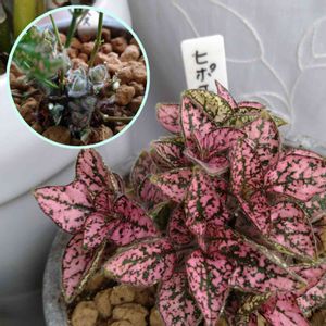 (左)ピンクのヒポエステスさんが伸びて、葉っぱが段々と小さくなって来たのを切り戻し✂️チョッキん。 (右)根元からピンクの色柄がハッキリとした新しい葉っぱが出て来ました(*^^*)