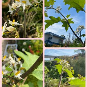 昨年栽培したナス🍆の台木から新芽🌱が出て来たので、そのまま育てて見ました。 背丈は160cmを超えて成長して、大きな切り込みのある葉っぱと白い花が咲きました。 花はナスの花に似ています。 調べてみたら「トルバムビガー」という植物です。 花後には実がなります。 緑色の皮が硬い葡萄のような実がなる様です。 糖度は28.8%だそうで、かなり甘いです。