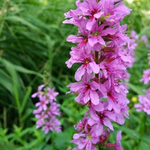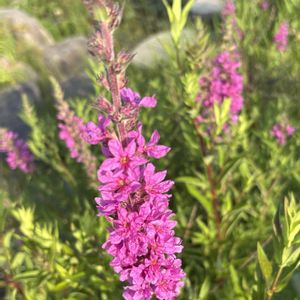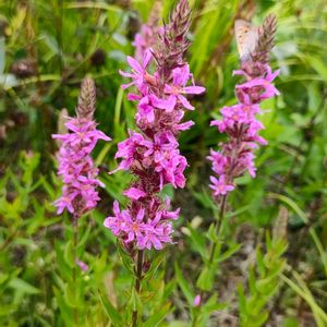 ❀今日のお花 ミソハギ エゾミソハギ (蝦夷禊萩) 🌱ミソハギ科 ミソハギ属 *地下茎が伸びて群生し、高さ50㎝~1.5mの多年草*茎は稜と突起状の短毛がある *葉は茎を抱くように対生し、広三角状披針形で、裏面に突起状の短毛がある *花は穂状に多数つき、径2㎝ほど ✽花弁は6個、雄しべは12個あり、花柱の長さに3通りある 低地の湿地や水辺などで見られます💜💜💜 ベニシジミさんが来てましたよ🦋