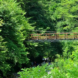 山梨県尾白川渓谷に掛かる橋です。 下にサントリー南アルプス天然水の、美しい川が流れていて人が遊んでいます。 私「この橋渡りたい❗」 夫「止めとけ❗」