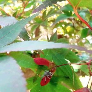 もみじの葉陰にお客人がいます! 初めてみる姿に しばらく図鑑とにらめっこ ……外来種キマダラカメムシの幼虫 カメムシなんだ…(・_・;