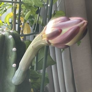 鬼面角観察日記 ①午後3時 先が開き初めている 写真を撮り元の窓辺へ ②午後9時 厚手カーテンを閉める前に見ると 開き初めているので玄関へ移動 ③満開は何時⁉️