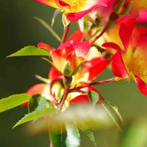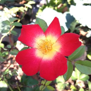 額割れしてきました カクテルさんです! 赤系のバラって早咲きが多いのかな 玄関前の南側雨の当たらない特等席で 病気にもならず 秋まで機嫌よく咲いています 私ここがいいって言ってるみたい😊