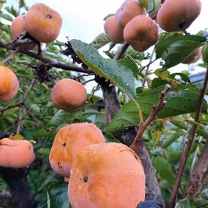🤍今日のお花 ではなくて実になってますが 柿(カキ) 今年は豊作! いつもは1個だけとか 寂しかったのに 何年ぶりかで 実が沢山つけてます😄 青空だったら 良かったのにな❣️ 多分、次郎柿では? 種がありますが とっても美味しいです😋💓