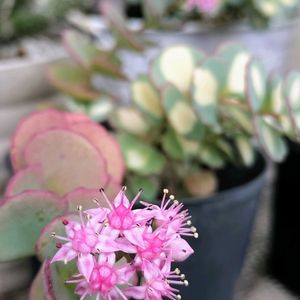 🩷斑入りミセバヤ🩷 たったこれだけが咲きました❣️ しかも斑入りの葉っぱ(後方)では無く斑の入ってない葉っぱから咲いてるわ🌿 理想では🩷の花だらけの予定でしたが 咲いただけ良いのかな🤗