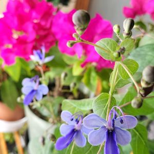 華やぐ縁側の 💜ブルーウィング💙 寒さに弱いとの事で縁側に避難させたけど つぶつぶが蕾なのか 咲き終わりなのかよく分からなかったの。 そしたら蕾だったみたいで沢山咲いてきました😄 クレロデンドロム ブルーウィングですが、 これからは普通にブルーウィングと言いますね💙 背後はまだ綺麗なブーゲンビリアさん! 2枚目はサザンカの花 先週見てもらったのとほぼ同じだけど 別の木のですよ🤩 こちらの方がふんわり咲くので好きです♥️