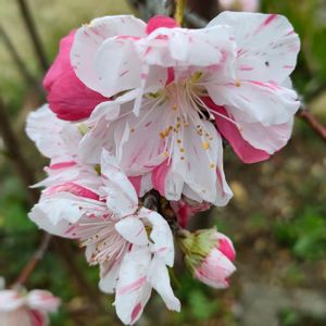 🌸枝垂れ花桃 源平咲き🌸 源平咲きなので紅白で色が混じりあって面白い花色です。 枝垂れの花桃で売られた時から頭頂部が切られてて 伸びてこなくて💦 高さ1mのまま。 もう少し伸びて垂れて欲しいけど。 去年から勢いのいい脇芽を伸ばして背を高くする計画してます🤩