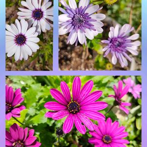 我が家のオステオスペルマム3種 咲きそろってきました😚 くびれなんかなくなりかけの左上😆 右上のは3Dタイプ 下のは昔からある私のアイコンの😄 どのタイプも挿し芽更新がオススメです😚 ほっとくと伸びまくります😅