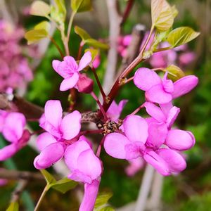 今日のお花 🩷️ハナズオウ🩷️ 終わりかけ…… 新芽も出てきてしまいました😃 サクラ咲く前から咲いてたような? これから新しい葉が 緑のハート💚になって来るのが 楽しみです🎶