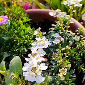 🤍イベリス🤍 白い花が少しづつ開いてきてます🤗 ひとつの大きな花に見えるのは うさぎの耳のような花が沢山集まった集合体です! 可愛いね〜 ラムズイヤーとかブラキカムと寄せ植えにしてありますが 3つ同時に咲くことは無さそうですね🙄