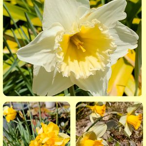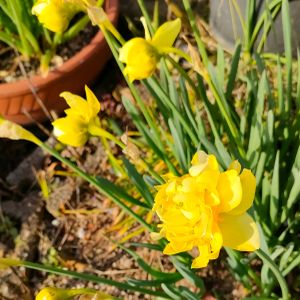 今の我が家の水仙3種💛💛💛 上のはいつもは右下のような普通のラッパ水仙だと思いましたが 品種変わりましたかー? 真ん中の副花冠が色が薄くて大きいですね🤗 今日は寒くて雨降り;(´•௰•`)☂ ソメイヨシノのつぼみも固まったままですー😆