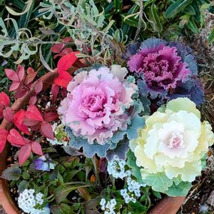 💐.°♡ビオラの青い花の開花が間に合いませんでしたが💦 葉牡丹入りの寄せ植えです。 葉牡丹、南天、アリッサム、ラベンダー、ビオラ 昨日の地震は愛知県でも2分くらいかなり揺れて、ハンギングの鉢がいつまでも揺れてました。 震源地の能登の方はまだ災害規模がわかってませんが 心配です。 何事も無い生活がどれほどありがたいことか! 考えさせられましたね🥺