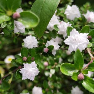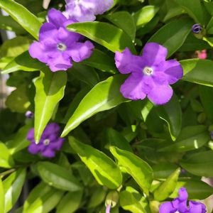 1⃣八重咲きハクチョウゲ クレマチスに隠れて こんなに可愛い花咲かせてました! 気がつくの遅くてごめん😄 2️⃣ホームセンターで発見! こんなに小さく2個も花を付けさせる技術、教えて欲しい🙏 9センチのポット苗だけど 見本として花咲かせてて驚き😆 3️⃣ニオイバンマツリ 今年初めて、株全体に💜🤍🩵3色の花が散らばり、 嬉しいわ😚