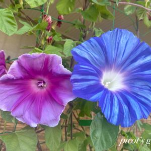 おはようございます😃 💜💙アサガオ💙💜 嬉しい事にまだまだ咲き続けてます💓 仲良くコラボしてました😄 まだまだ暑いですが 元気に過ごしましょう💕